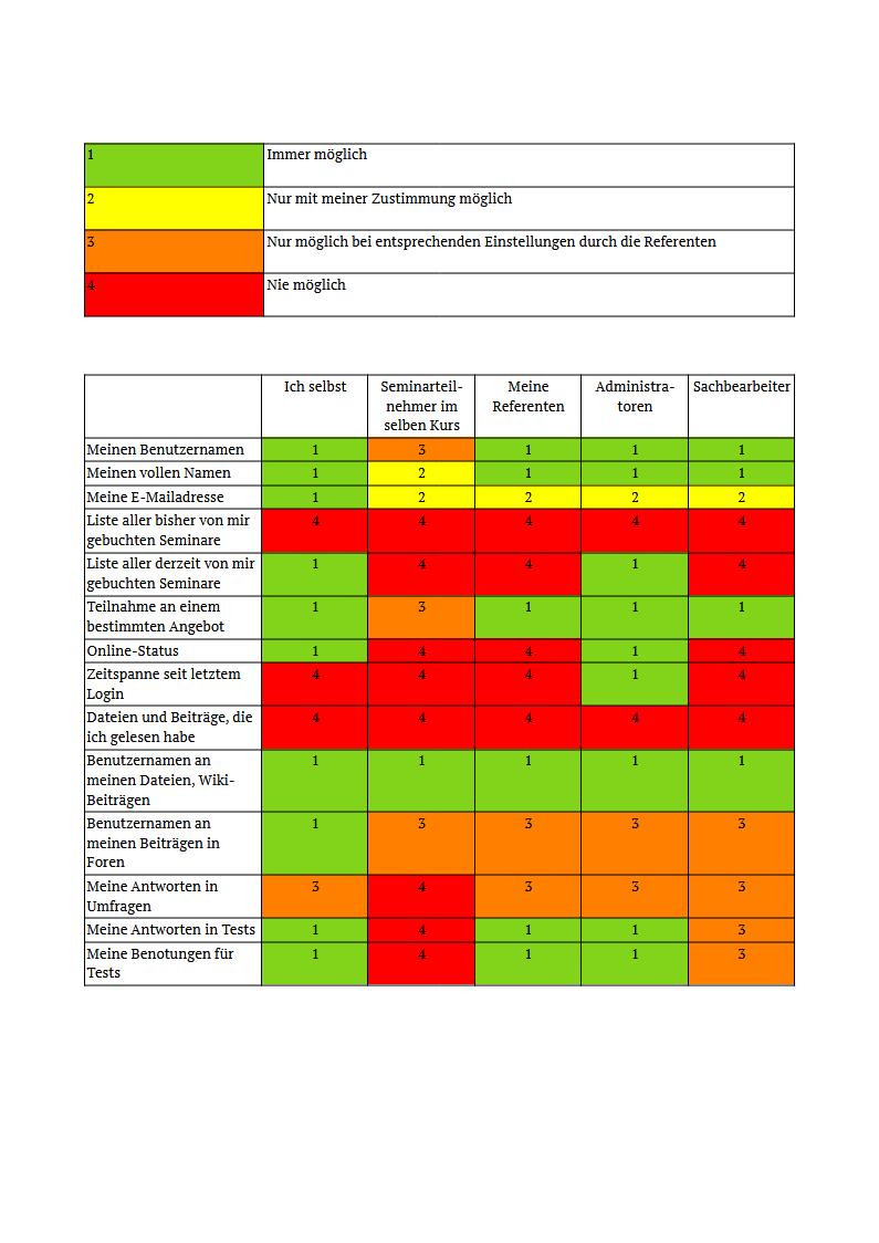 Da die eLearning-Plattform eine Online-Lern- und Kommunikations-Plattform ist, die u. a. die digitale Kommunikation und Kollaboration zwischen den Benutzern ermöglichen soll, sind Daten teils für andere Benutzer einsehbar. Um Ihnen den Überblick über die Sichtbarkeit Ihrer Daten auf unserer eLearning-Plattform zu erleichtern, geben wir Ihnen die nachfolgende Rechtematrix zur Einsicht.